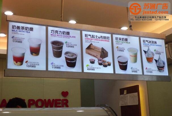 奶茶燈箱:廣泛使用于各式特色飲料店,特色小吃店等,用于廣告宣傳、產品及價格展示、銷售信息、各類告示等。